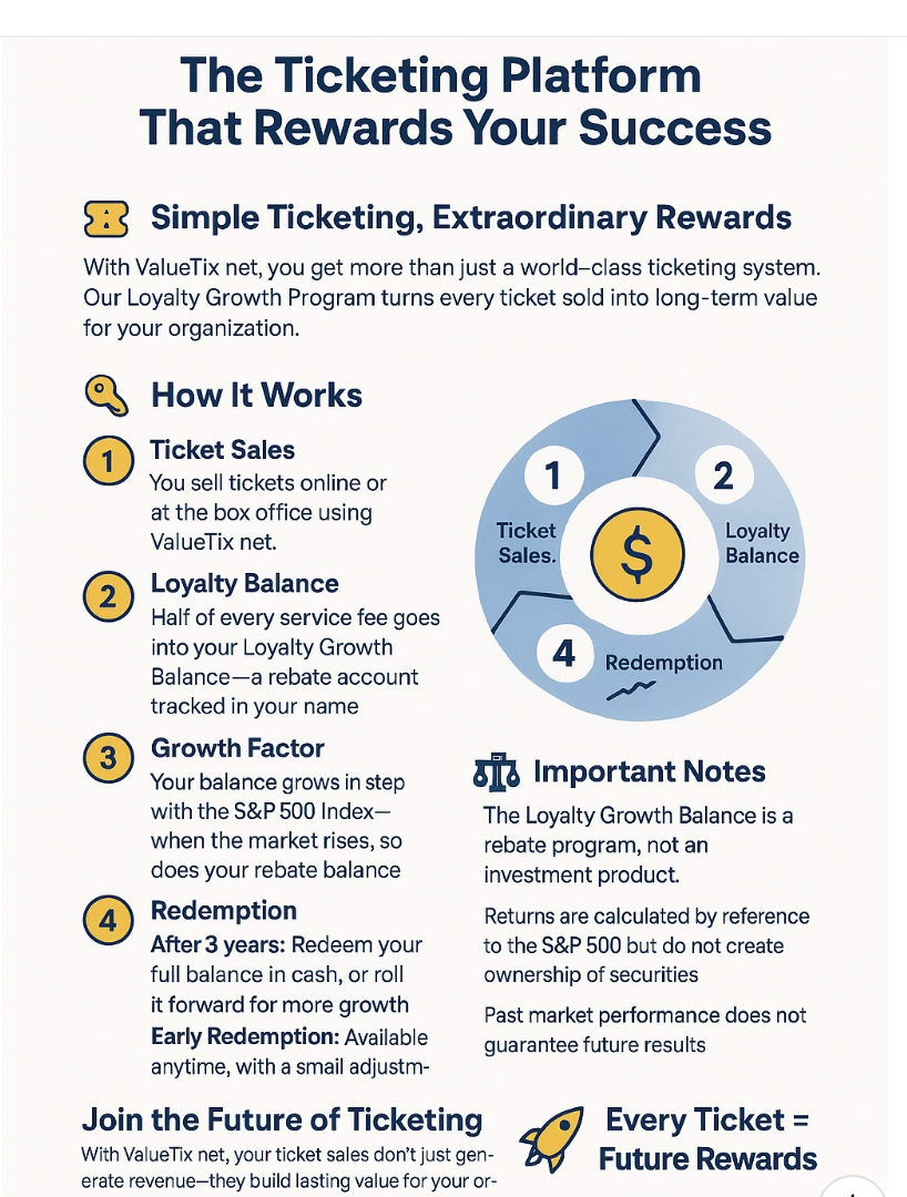 At ValueTix.net, we believe every ticket sold should bring long-term value to your organization. That’s why we created the ValueTix Loyalty Growth Program — the only ticketing system that grows with you.